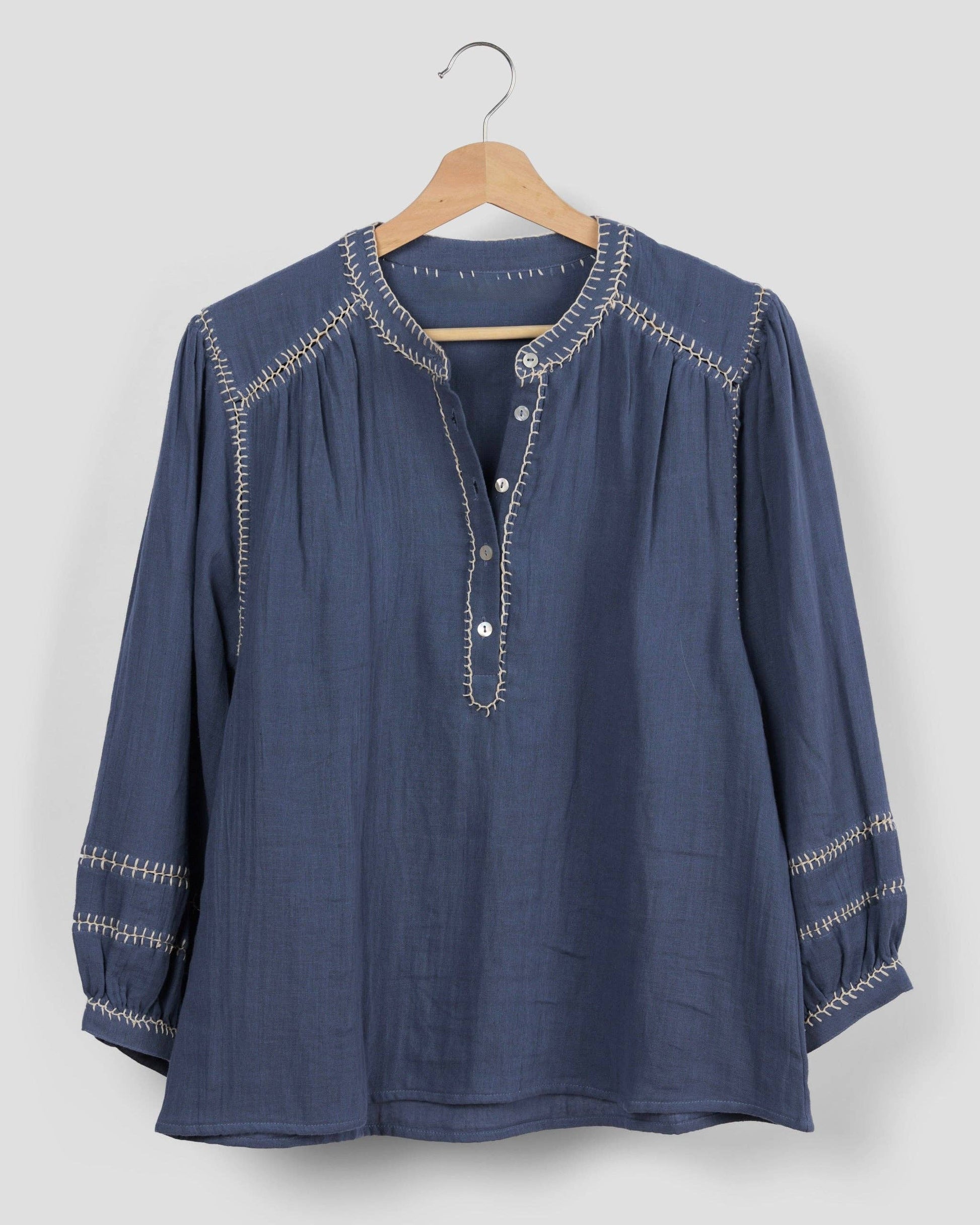 This blouse has hand embroidered "feather stitching at seams to give a stunning contrasting effect. Based on our best selling Amelie blouse shape, this is a loose fit with bracelet length sleeves.