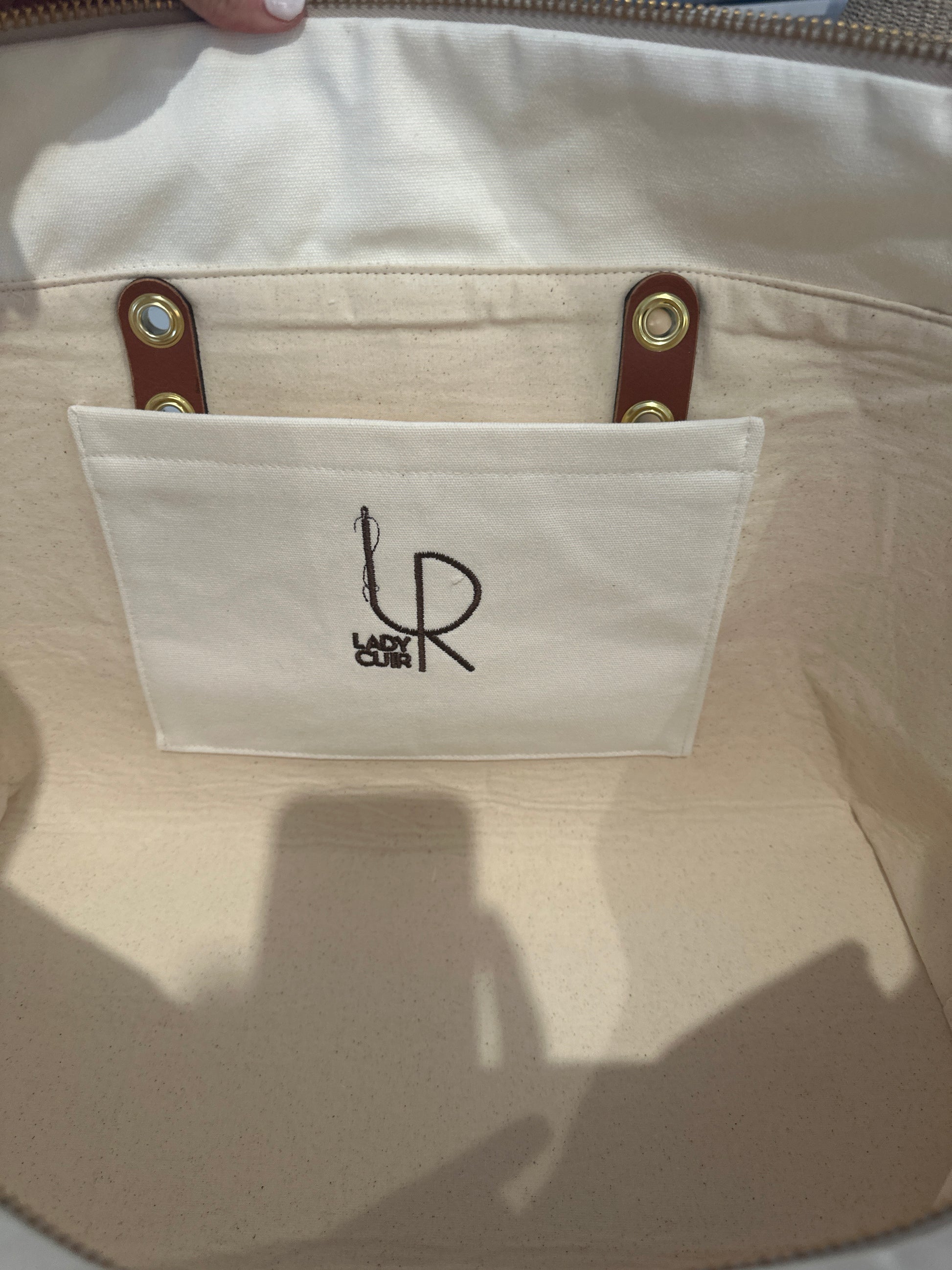 This up-cycled garment bag tote started as a designer garment bag, no longer needed but too beautiful to discard. I reimagined it into a classic canvas tote, complete with custom-made leather handles and a sturdy leather bottom. Zipper closure.