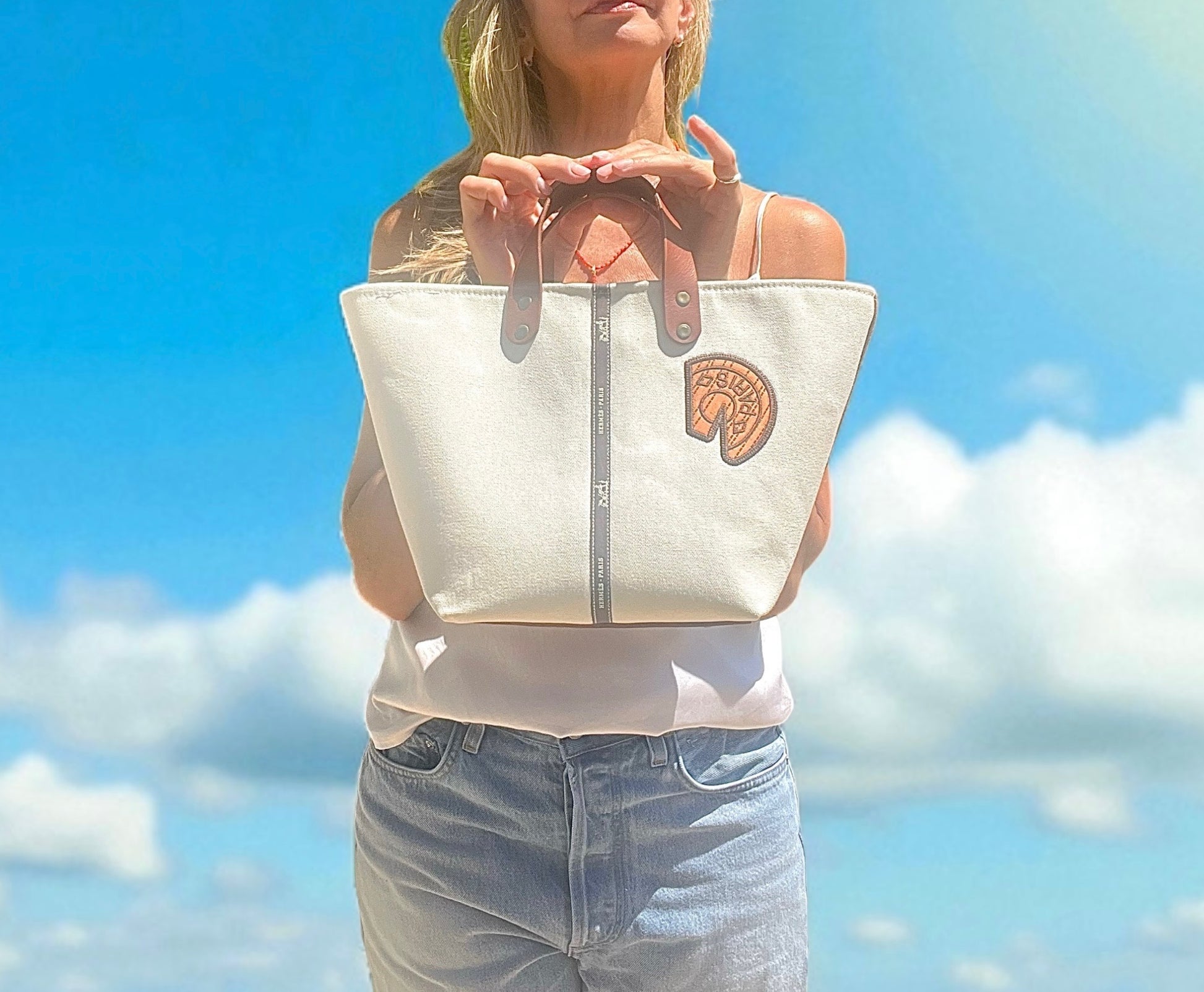 Made from an authentic Hermes garment bag repurposed to create a one of a kind mini tote. The patch is repurposed Hermes Scarf.